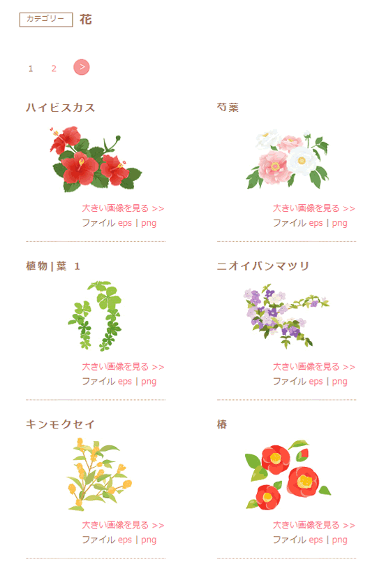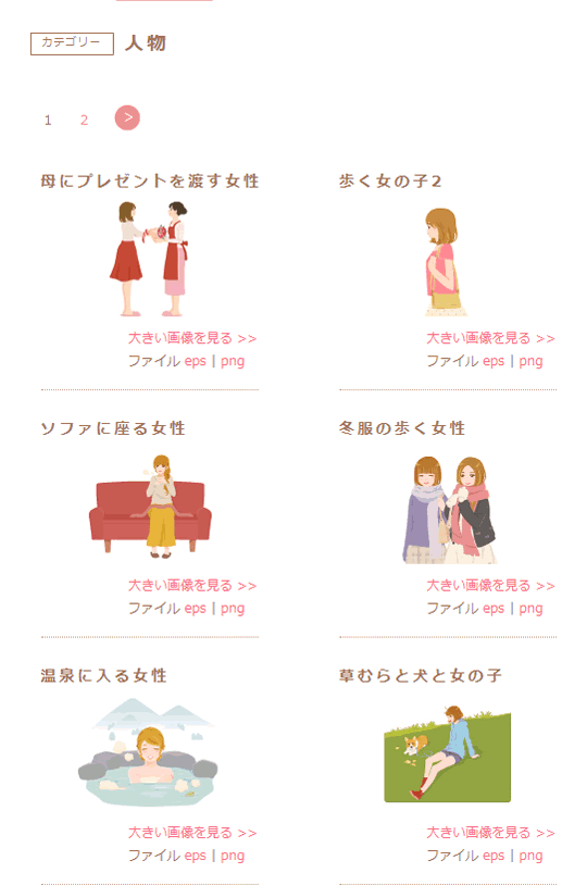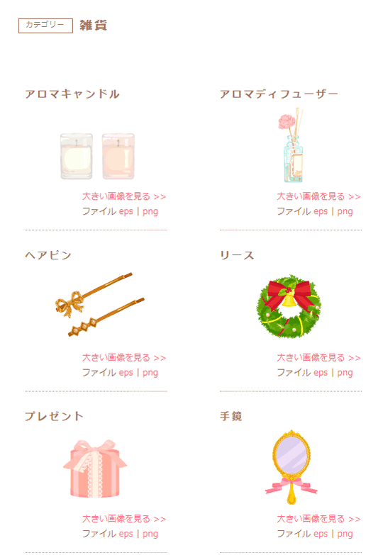 ガーリー素材さんでは、人物、花、生物、食べ物、雑貨など、分かり易いカテゴリーで分類されています。なんだか、見ているだけでもほっこりしてきますよ。