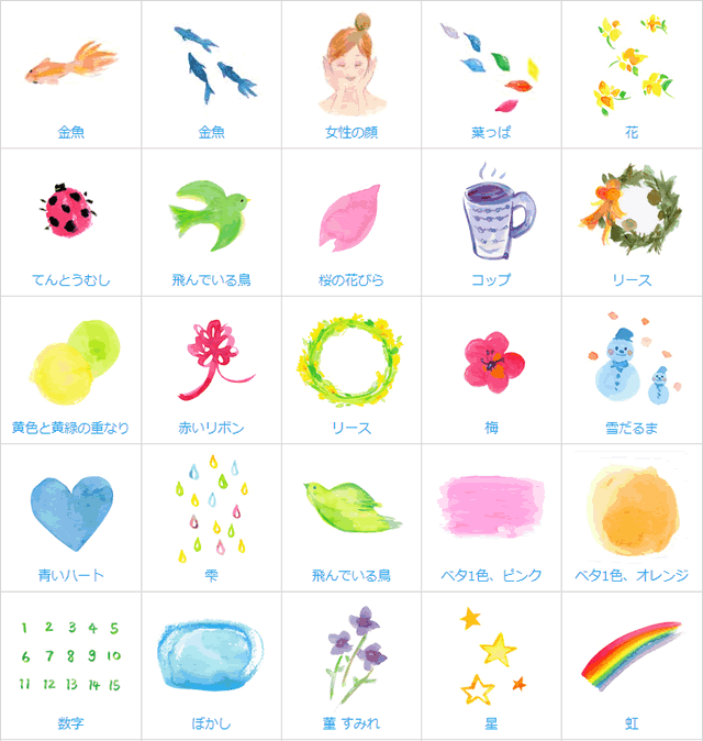 魚の群れ,金魚,女性の顔,葉っぱ,花,てんとうむし,鳥,桜,コップ,リース,リボン,リース,梅,雪だるま,ハート,雫,数字,菫,すみれ,星,虹,魚,チューリップ,花,植木,木,飾り線,葉っぱ,人物,暮らし,テクスチャー,線,吹き出し,植物,数字,記号,アイコン,季節,自然,動物,魚,クリスマス